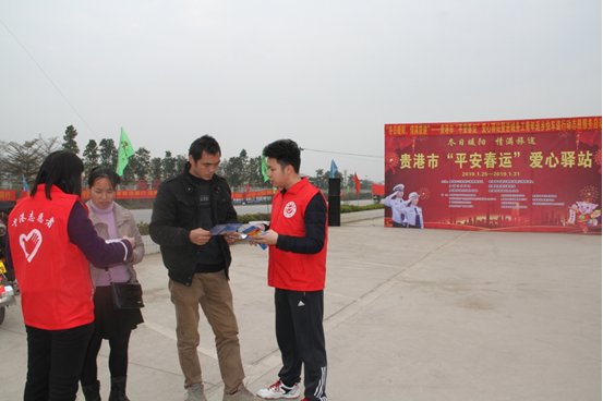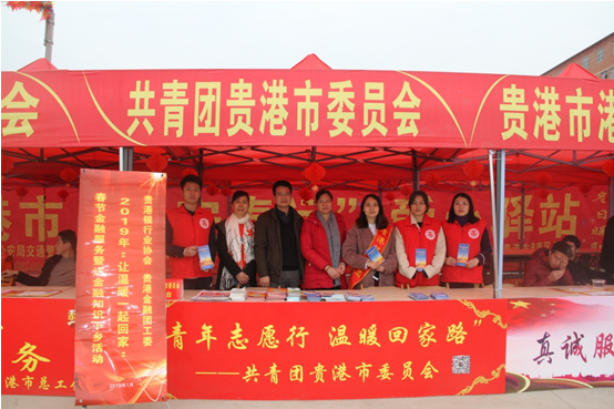 2019春节外出务工人员返乡高峰之际,贵港银行业协会与贵港金融团工委组织贵港金融青年志愿者服务队,开展“让温暖一起回家”春节金融服务暨送金融知识下乡活动。于2019年1月25日开始陆续在辖区各返乡青年接待站,为返乡青年、外出务工“摩托车”大军递一杯热水、盛一碗热粥,同时发放农村扶贫和青年创业金融服务政策知识宣传手册,宣讲防范非法金融活动、新型电信诈骗、非法集资等金融知识。活动的开展,不仅取得良好的社会反响,同时也进一步拓展了贵港银行业服务“三农”和支持农村青年创业就业金融服务的深度和广度,不断增强了银行业青年员工社会责任感和服务意识。辖区各银行业金融机构同步开展了春节送温暖活动。