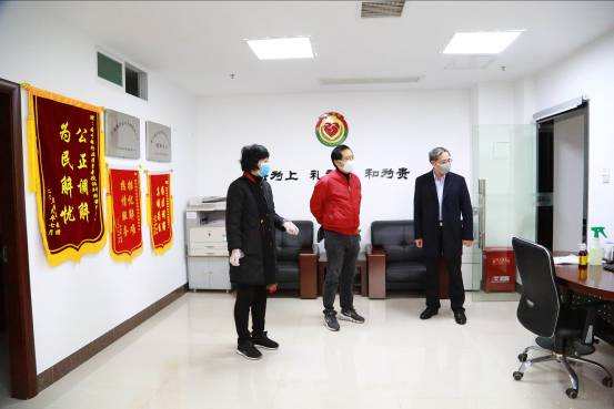 图为禤东同志在南宁银行业消费者投诉纠纷调解中心了解疫情防控及工作开展情况