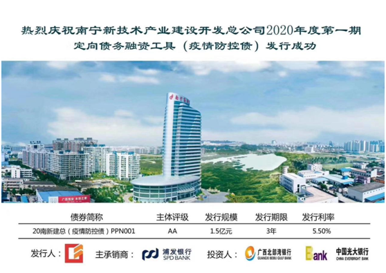 3月19日,广西北部湾银行作为投资人的南宁新技术产业建设开发总公司的定向债务融资工具(疫情防控债)在银行间市场成功发行。这是疫情发生以来广西发行的首单疫情防控债务融资工具。该债劵的发行,主要用于支持企业偿还到期债务,助力企业疫情防控以及复工复产。