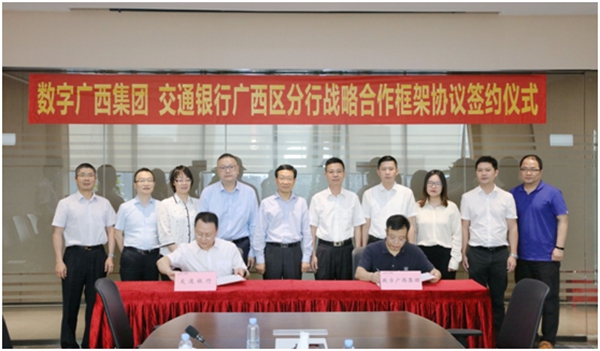 6月15日,交通银行广西区分行与数字广西集团有限公司签署战略合作框架协议。交通银行副行长殷久勇、普惠金融部总经理李亚,交通银行广西区分行行长江洲,数字广西集团董事长刘洪共同出席签约仪式,交通银行广西区分行副行长黄韶宇、数字广西集团总裁刘翔分别代表双方签署合作协议。