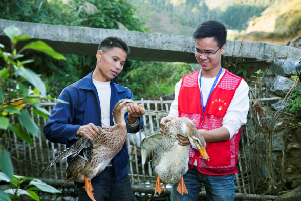 交通银行广西区分行驻河池市巴马瑶族自治县所略乡平六村扶贫第一书记赵斌(右一)向村民了解“土鸭”养殖情况。
