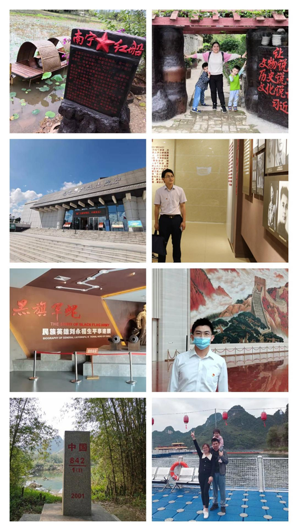 “国庆红色游”活动。鼓励支部党员自行利用国庆假期,与家人一同探访广西红色游学精品线路。支部党员刘萍与家人追寻中共广西早期党组织活动足迹的“南宁红船之旅”,蒋涛与家人回望振奋人心昆仑关大捷的“南国抗战之旅”,李滨与家人重温习总书记在广西考察线路的“八桂建设成就之旅”,韦学滨与家人追忆为边疆永固牺牲英烈们的“红色边关之旅”。通过“国庆红色游”活动,引导大家从百年党史中传承优良家风,把革命前辈的红色家风传承好发扬好,修身齐家,争做家风建设表率。