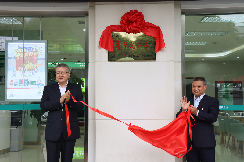 邮储银行广西区分行行长王志平、南宁市分行行长罗杰共同为“全国青年文明号”揭牌。