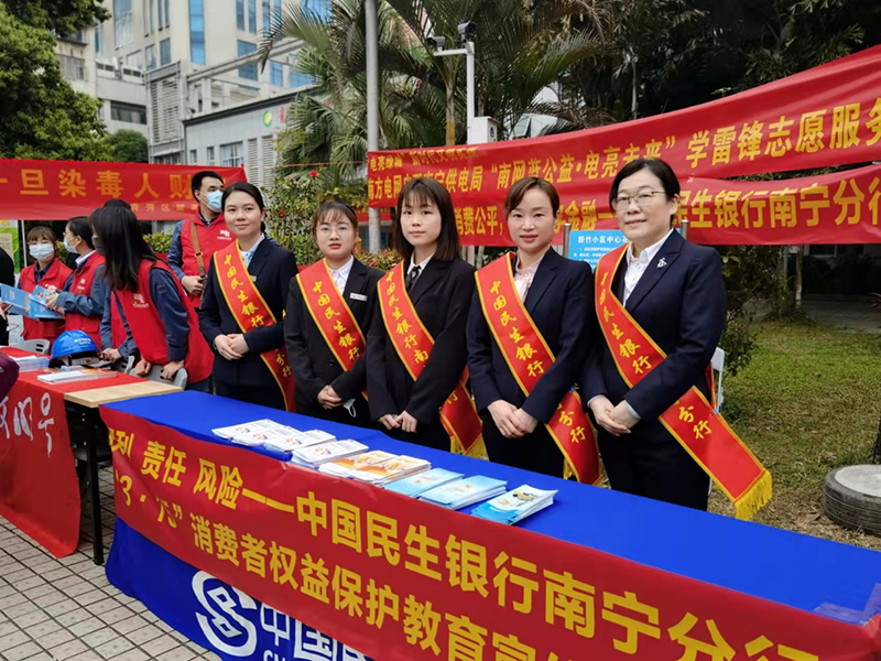 在学雷锋纪念日和3.15金融消费者权益日来临之际,民生银行南宁分行践行金融为民的初心,积极投入到青秀区团委、各社区居委会开展的志愿服务活动中,截止3月13日,已为新竹、金洲、长湖、桂雅、平岭等十六个社区约1500名居民送上金融知识普及宣传。
