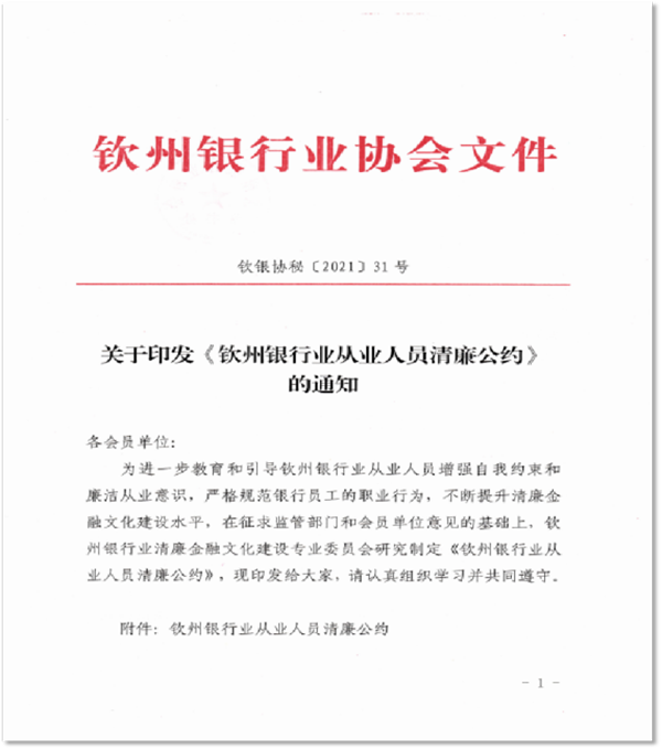 通过钦州银行业协会发布《钦州银行业清廉金融文化建设倡议书》,制订《钦州银行业从业人员清廉公约》,加强银行从业人员廉洁教育。各银行机构积极打造清廉金融文化长廊等,在系统上下营造崇廉尚洁的工作氛围。“内控合规管理建设年”活动为契机,以合规内控文化建设为重点,推动银行机构切实增强银行业从业人员的道德品行、职业操守和法治意识。