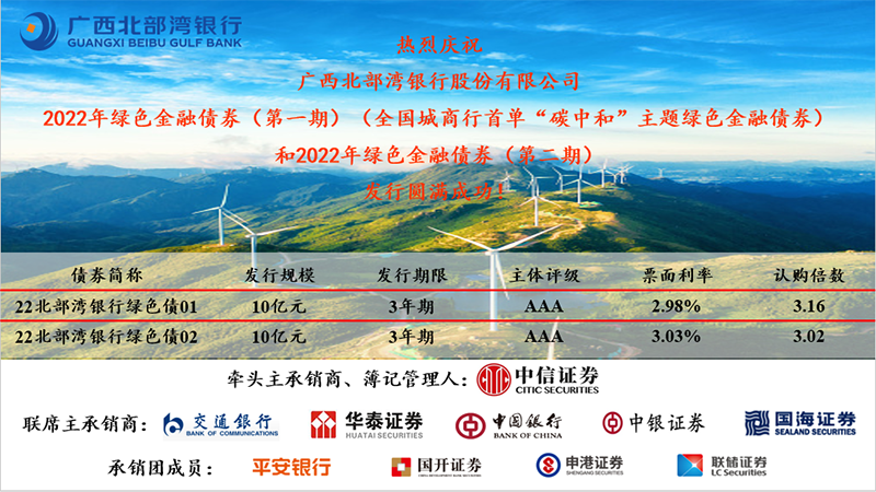 当天,广西北部湾银行还同步发行了2022年第二期绿色金融债券,发行金额10亿元,利率3.03%,全场认购倍数为3.02倍。本次债券成功发行后,该行存续期绿色金融债券规模达90亿元。