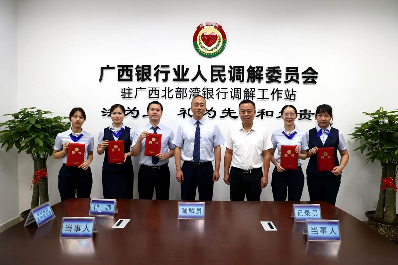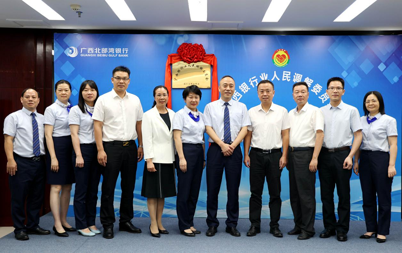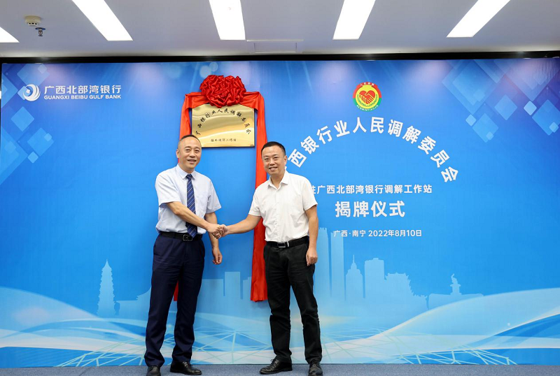8月10日,广西银行业人民调解委员会驻广西北部湾银行调解工作站正式挂牌成立,这是广西银行业人民调解委员会第6家驻外调解工作站,也是广西北部湾银行进一步贯彻落实习近平总书记关于“把非诉纠纷解决机制挺在前面”重要指示精神的举措,标志着广西北部湾银行金融纠纷多元化解机制建设工作开启新篇章。广西银行业协会副会长兼秘书长毛宁,广西北部湾银行副行长、总法律顾问谷壮海参加揭牌仪式。