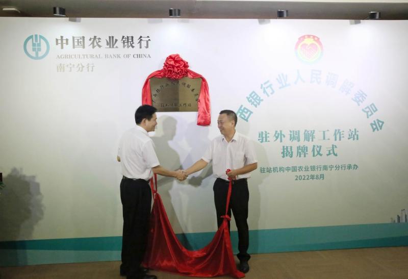 8月12日,广西银行业人民调解委员会驻农业银行南宁分行调解工作站正式挂牌成立,这是广西银行业人民调解委员会第7家驻外调解工作站。驻外调解工作站的设立,将促进非诉讼调解与诉讼调解的有效衔接,把调解挺在诉讼之前,多元化解金融纠纷。广西银行业协会副会长兼秘书长毛宁,农业银行广西区分行党委委员、副行长江涛参加揭牌仪式。