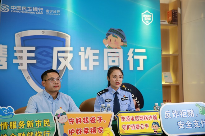 11月24日晚,一场寓教于乐、融学于趣的直播活动在民生银行南宁分行热烈举行。为有效防范电信网络诈骗违法犯罪,全面提升广大人民群众防范意识能力,切实保障人民群众财产安全,增强广大群众的获得感、幸福感、安全感,该行携手南宁市公安局巡警(反诈)支队,共同开展“警银携手 反诈同行”金融知识进万家,防范电信网络诈骗直播公开课,为广大群众传授防范电信诈骗的“武功秘籍”。