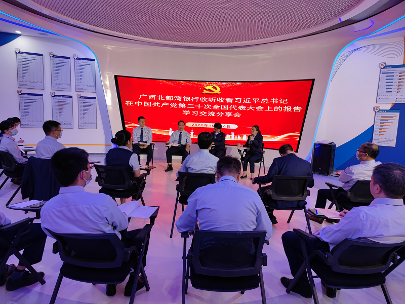 (广西北部湾银行在组织党员集中收看党的二十大开幕会后,第一时间召开学习分享会)