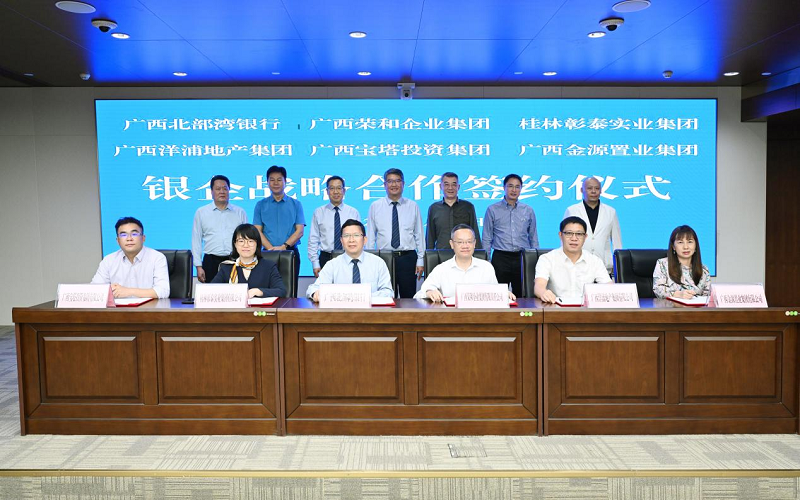 11月29日,广西北部湾银行举行支持地产行业平稳健康发展座谈会暨银企战略合作签约仪式,与广西荣和企业集团有限责任公司、桂林彰泰实业集团有限公司、广西洋浦地产集团有限公司、广西宝塔投资集团有限公司、广西金源置业集团有限公司等5家广西本土优质民营房地产企业签署“总对总”战略合作协议,意向合作授信金额超150亿元。