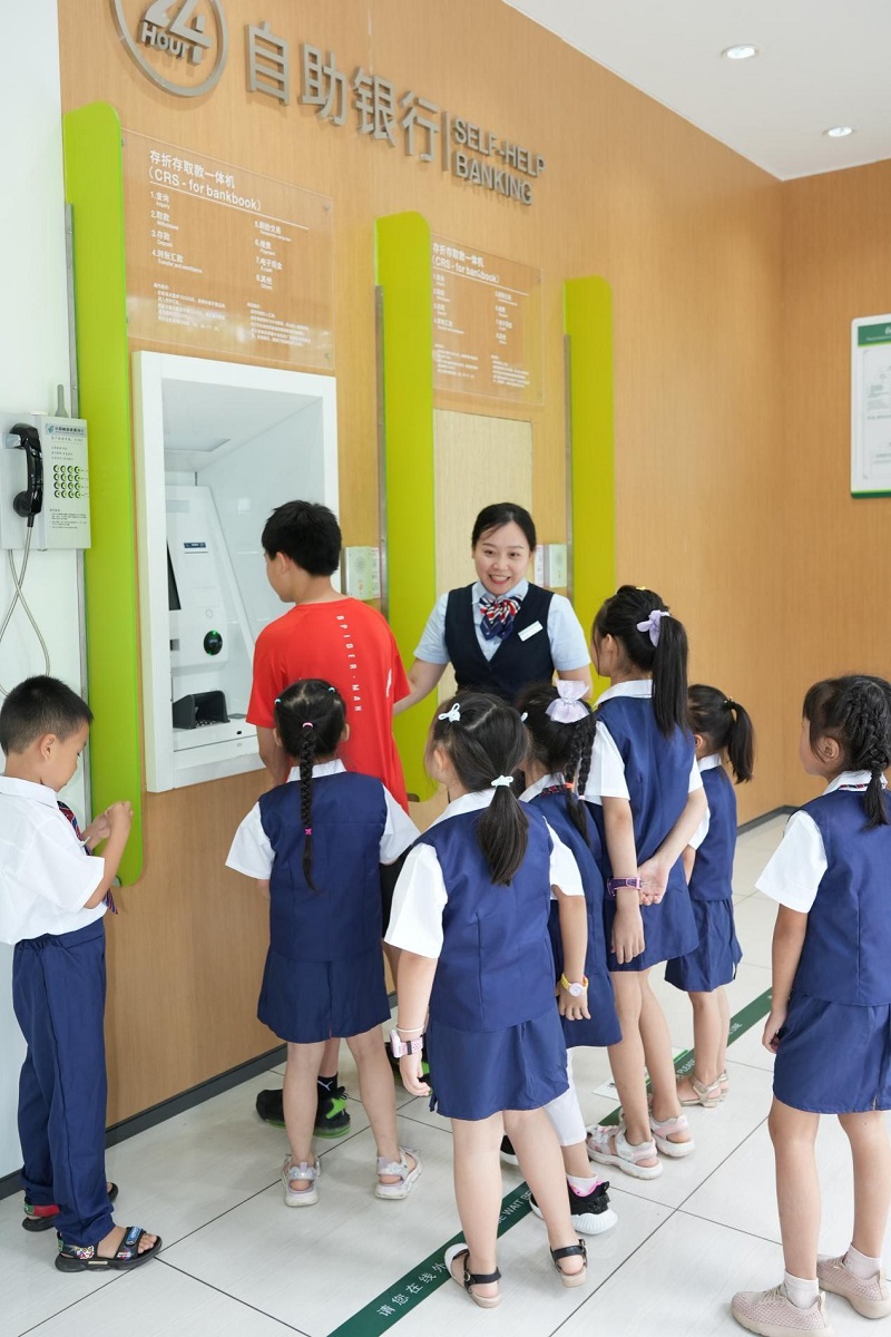 图:邮储银行广西自贸实验区南宁片区歌海路支行工作人员指导小朋友认识智能叫号机、智能柜员机ITM、自动存取款机ATM等银行设备的功能和操作