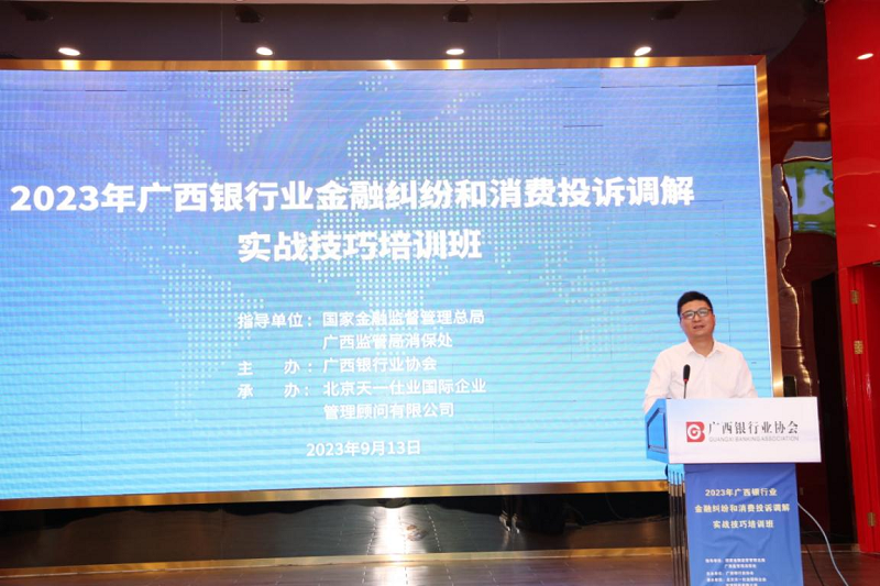 为进一步提高广西银行业消保人员及调解员的专业能力和调解水平,打造一支具有专业水准和较高调解技能的解纷队伍,顺应新时期金融纠纷治理的新要求。9月13日,广西银行业协会举办2023年广西银行业金融纠纷和消费投诉调解实战技巧培训班。广西银行业协会专职副会长晏伟、国家金融监督管理总局广西监管局消费者权益保护处副处长李小冰、各会员单位消保工作部门负责人及消保人员、各地市监管分局消保工作负责人及消保人员、各地市银行业协会和银行分支机构消保工作负责人及调解员、各律师事务所调解专家及特邀调解员等200余人参加现场培训。