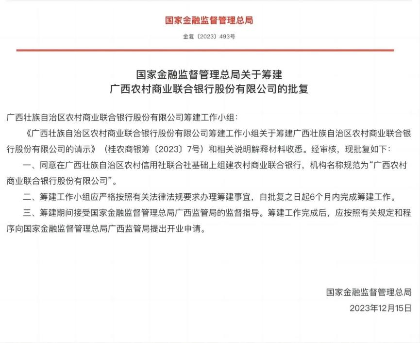 2023年12月,国家金融监督管理总局批复同意筹建广西农村商业联合银行股份有限公司,这是继浙江、辽宁、河南、山西之后的全国第五家、中央金融工作会议召开后首家获批的省级农商(联合)银行,改革进度位居全国新一轮深化农信社改革的省份前列。广西农村商业联合银行的获批筹建,为全区地方金融业高质量发展注入了澎湃新动能。