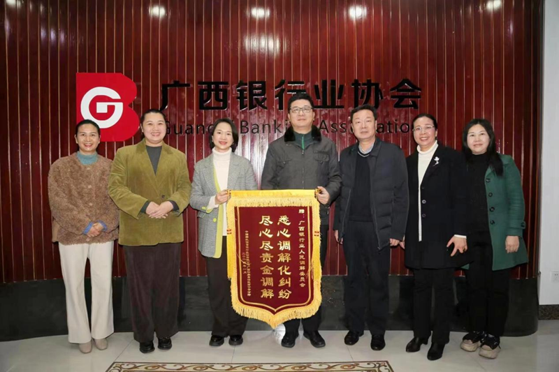 最后,吴绚副行长对广西银行业人民调解委员会近期协助成功化解一起个人疑难复杂纠纷案件表达真挚的谢意。并代表邮储银行南宁市分行向广西银行业人民调解委员会赠送“悉心调解化纠纷 尽心尽责金调解 ”的锦旗。晏伟专职副会长表示,这既是对协会工作的充分肯定,更是一种鼓舞和激励。广西银行业协会将再接再厉,积极履行“自律、维权、协调、服务”职能,持续提升为会员服务水平,助力广西银行业高质量发展。