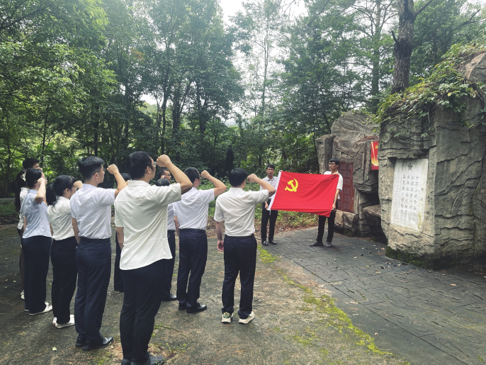 在上思县念板沟军事会议遗址,全体党员通过参观珍贵历史文物和聆听讲解,系统了解从粤桂边区人民解放军在解放战争时期的革命斗争历程,深切感悟革命先烈为解放广西、推动革命事业发展的崇高精神和伟大贡献。 在庄严肃穆的氛围中,党员干部面向党旗,整齐列队,高举右拳,重温入党誓词,砥砺初心使命,铿锵有力的誓言回荡在林间。
