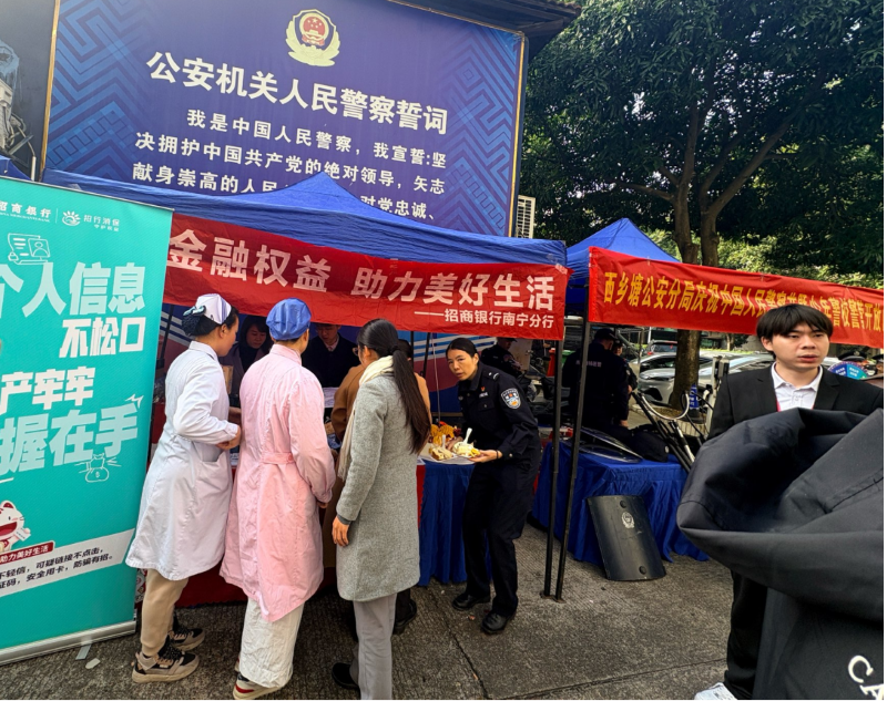 为持续深化金融知识普及工作,织密金融安全防护网,招商银行南宁分行以“110警察节”为契机,走进西乡塘公安局,开展了一场“保障金融权益,助力美好生活”金融主题宣传活动。活动通过设立金融知识宣传专区,并送上定制主题蛋糕,以“甜蜜祝福+专业服务”的双重心意,向守护一方平安的民警同志致以节日问候。活动创新采用“趣味游戏+知识宣讲”的融合模式,将金融安全知识有机融入节庆氛围,为民警同志及家属带来了一场兼具温度与干货的金融知识“微讲堂”。