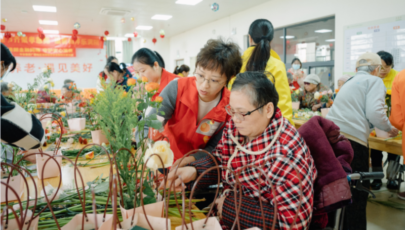 传承雷锋精神,践行敬老初心。活动现场,分行党员代表为长者们送上慰问品与暖心问候,与长辈唠家常、询问身体近况,以贴心陪伴传递温暖。活动还特别策划花艺插花环节,党员志愿者耐心协助长者修剪花枝、搭配花束,手把手帮助行动不便的长辈完成创作,现场花香四溢、笑语连连,让“孝慈相伴”的主题真正落到实处。