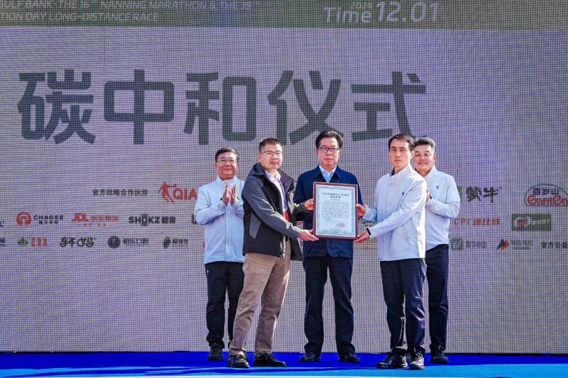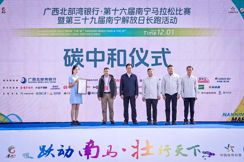 为深入贯彻落实党中央、国务院关于碳达峰、碳中和的重大战略决策部署,以实际行动践行习近平生态文明思想,倡导绿色低碳生产生活方式,广西北部湾银行与活动主办方合作,将本次马拉松比赛活动办成一届碳中和的体育赛事。广西北部湾银行助力活动主办方科学制定了活动碳中和实施计划,优先实施了温室气体减排措施,对本次活动排放的996.69吨二氧化碳当量温室气体,由北行通过购买广西首批发行的林业碳票项目——河池市环江毛南族自治县华山林场(一期)林业碳票项目碳减排量1050吨,捐赠给本次活动主办方用于抵消本次活动产生的温室气体,达成广西大型体育赛事的首次“碳中和”。本次赛事的“碳中和”活动也是2024年广西北部湾银行“北斗星”公益计划活动,成为“金融+体育+文化+公益”的又一成功实践。