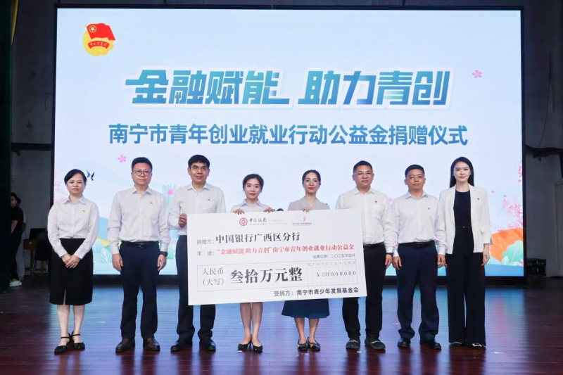4月20日,中国银行广西区分行联合共青团南宁市委在广西财经学院举办“金桂星火”党建志愿服务活动,通过“金融+公益”合作模式向南宁市青少年发展基金会捐赠30万元公益金,正式启动“中银赋能·青创启航”公益品牌计划,构建起政银校三方联动的青年创业就业支持体系。中国银行广西区分行纪委书记余维国、共青团南宁市委书记陈国栋、广西财经学院团委书记芮红磊及广西金融团工委相关负责人出席本次活动。