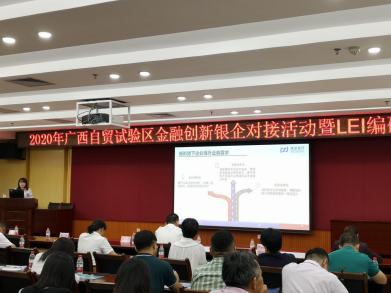 为促进广西自贸试验区企业和银行掌握金融开放创新政策、推广LEI 编码应用,推动金融资源精准对接自贸试验区企业,人民银行南宁中心支行联合6家商业银行于2020年9月21日举办了“2020年中国(广西)自贸试验区金融创新银企对接活动暨LEI编码推广专题培训”。