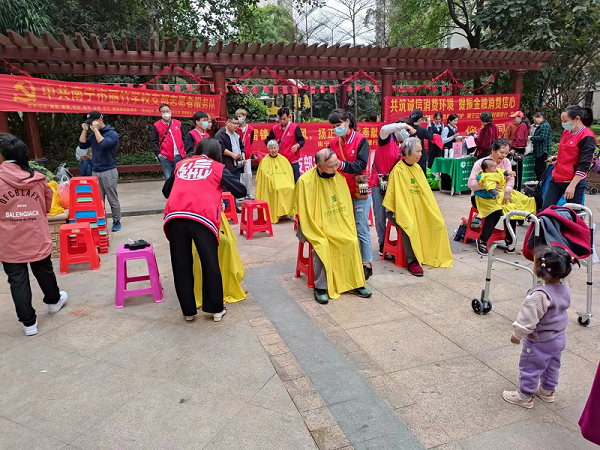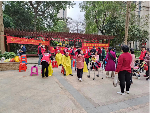 丽竹学校的学生还积极发挥自身优势,把宣传活动现场变成一个大型露天理发厅,为小区居民提供免费理发便民服务,理发“师傅们”耐心地询问居民的喜好,认真细致地为他们修剪头发,娴熟的技术和贴心的服务收获了居民们一致好评,赢得大家纷纷点赞。宣传交流现场气氛热烈,小区居民与工作人员一问一答,在欢声笑语中吸收金融知识,了解金融风险。