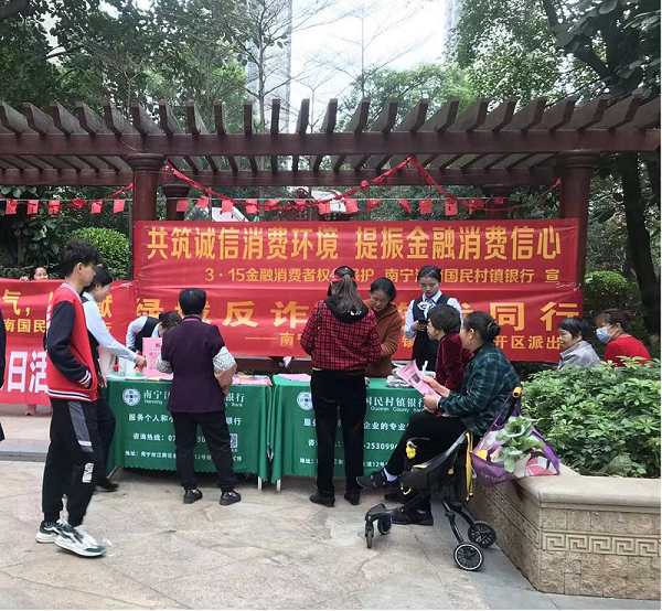 为把金融消费者权益保护工作落到实处,南宁江南国民村镇银行结合“3·15教育宣传周”活动要求,以“共筑诚信消费环境 提振金融消费信心”为主题,聚焦“一老一少一新”重点群体的金融需求,积极开展“3·15”消费者权益保护教育宣传周活动,守护老人幸福晚年,守护孩子平安成长,守护新市民美好生活,让教育宣传更有温度。