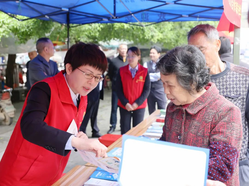 △桂平联社副主任赖小庆(左一)给群众发放宣传资料,讲解宣传知识