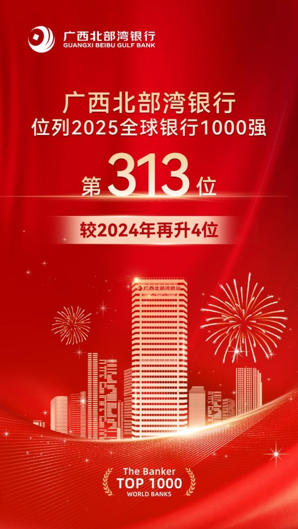 7月2日,英国《银行家》杂志(The Banker)发布2025年“全球银行1000强”榜单,广西北部湾银行排名第313位,较上一年度再升4位,连续7年实现进位,综合实力、核心竞争力和发展韧性持续增强。