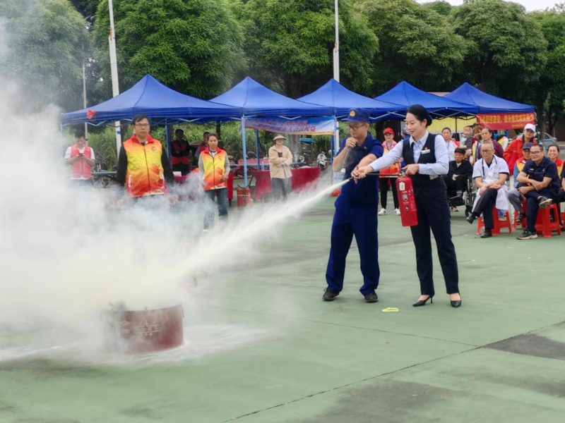 消防演练环节,教官结合真实案例,生动讲解火灾预防、扑救及逃生知识。针对大家关心的灭火器使用,现场演示“提、拔、握、压”规范步骤,并强调安全要领。随后,居民与志愿者们分组实操,亲自操作灭火器扑灭模拟火点,切实掌握初期火灾应对技能。