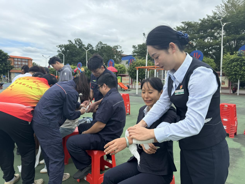 急救培训同样注重实用。医护人员通过讲解与示范,系统介绍心肺复苏的操作流程,包括意识判断、胸外按压、人工呼吸等关键步骤,并手把手指导海姆利希急救法和伤口止血包扎技巧。参训人员认真听讲、积极练习,在互动中掌握了基础急救方法。