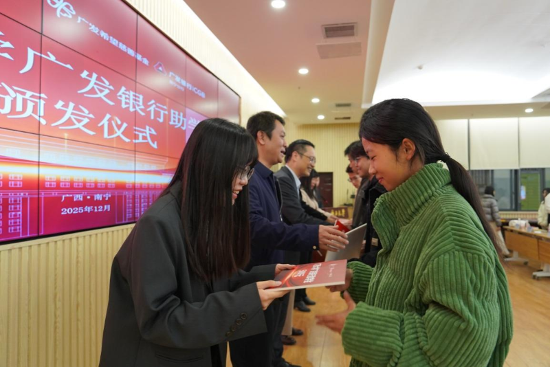 2025年12月30日,“广发银行助学金”颁发仪式在广西大学温情举办。广发银行南宁分行党委书记、行长李苑鸿,广西大学教育发展基金会秘书长周海斌以及广西青少年发展基金会项目负责人出席仪式,广西大学教育发展基金会副秘书长主持仪式。