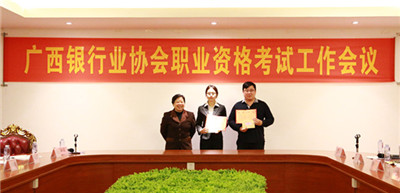 图为协会秘书长刘满莲与获得2017年度广西银行业专业人员职业资格考试组织工作先进单位(二等奖)代表合影