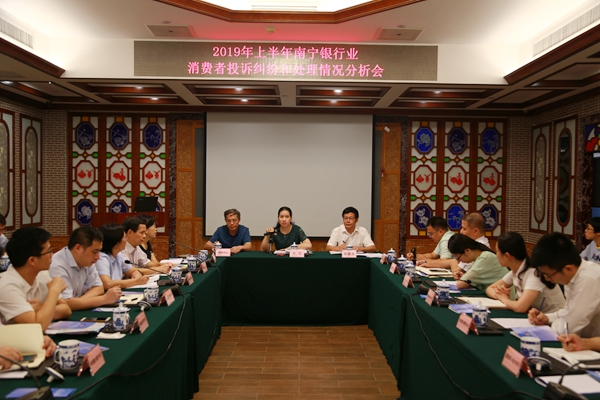 2019年7月25日,广西银行业协会在南宁召开2019年上半年南宁银行业消费者投诉纠纷和处理情况分析会,分析上半年南宁银行业消费者投诉和处理情况,听取会员单位经验交流及对消费者权益保护工作的意见和建议。22家银行机构消保部门负责人和工作人员、广西银保监局消费者权益保护处李蕊副处长、南宁银行业消费者投诉纠纷调解中心全体人员参加了会议。会议由广西银行业协会专职副会长黎滨海主持。