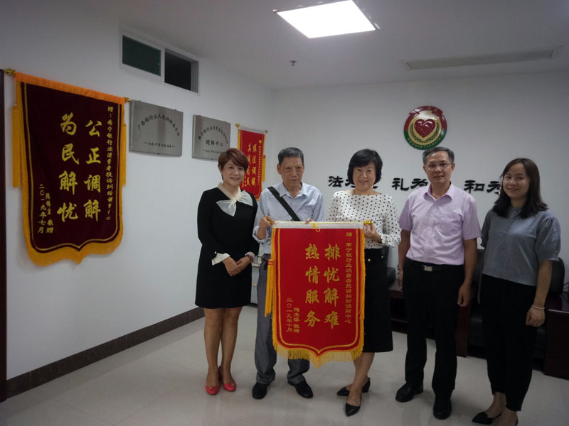 近日,金融消费者陶先生来到南宁银行业消费者投诉纠纷调解中心,将一面印有“排忧解难,热情服务”的锦旗送到广西银行业协会领导手中,对调解中心表示诚挚的谢意。