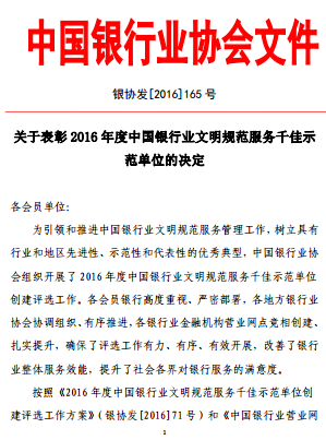 关于表彰2016年度中国银行业文明规范服务千佳示范单位的决定