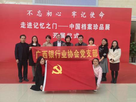 2019年12月25日,为走进历史、了解历史、感知历史,培育和践行社会主义核心价值观,弘扬爱国主义精神,在支部书记带领下,广西银行业协会支部党员、青年学习第十一小组成员前往南宁市国家档案馆参观“不忘初心、牢记使命,走进记忆之门——中国档案珍品展”。