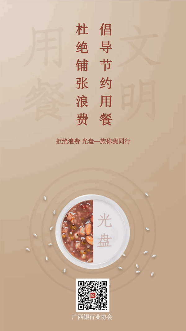 倡导勤俭节约,弘扬中华民族传统美德,坚决制止餐饮浪费行为,切实培养节约习惯,积极营造浪费可耻、节约为荣的氛围,以实际行动落实习近平总书记有关制止餐饮浪费重要指示精神,在全社会引领节约用餐良好风尚,倡导文明健康生活方式。广西银行业协会发出如下倡议: