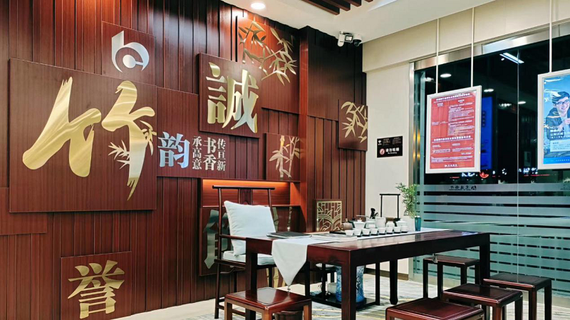 交通银行南宁高新区支行以竹元素展示“书香雅韵、学苑文化”的高新特色,助力南宁高新区及重点高校客群的快速、稳健发展,形成了“产、教、银”融合的经营发展模式,以及“竹韵承高意,书香传亘新”的服务文化理念。