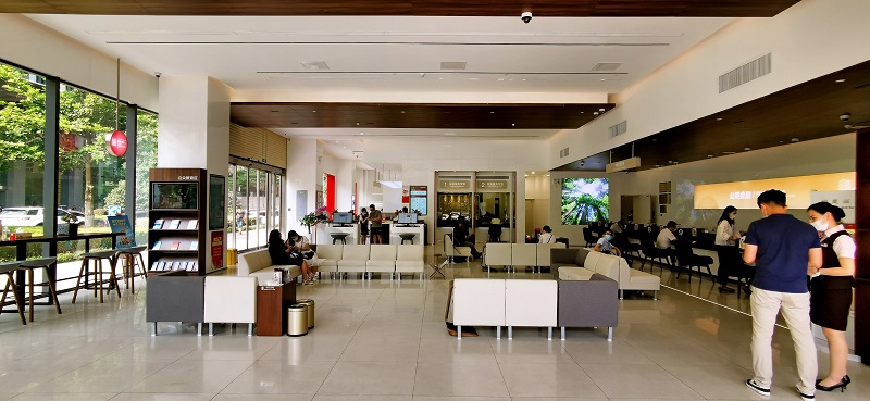 顺应“互联网 +”新零售时代下客户的行为习惯,营业部升级 3.0 营业环境,全面体现了“科技 + 生活”理念的创新。一是功能服务区域上划分合理、自主空间大,各种业务设备科学合理地整合嵌入柜台,客户可以迅速找到对应的功能区,办理业务的途径清晰明了。二是营业厅将服务设备功能进行整合、缩小设备体积,如整合引导台和叫号机器为一体,向客户提供 IC 卡读取器、第二代身份证阅读器、二维码阅读器、刷卡等多项选择;可视柜台集人工智能、远程视频于一体;理财室用的VTM 机带有 360 度旋转功能;金葵花区的洽谈间配备了雾化玻璃一键切换,既具科技感又有效保护了客户隐私等。三是结合网点地域特点,配置更人性化的设施以提升客户体验。如营业厅布置了吧台休闲区,客户等候区沙发款式色彩简洁,等候区旁设置有手机充电站、感应垃圾筒,可移动的填单小桌也很方便,还针对年轻客群增设了母婴室、咖啡小站等主题场景等。