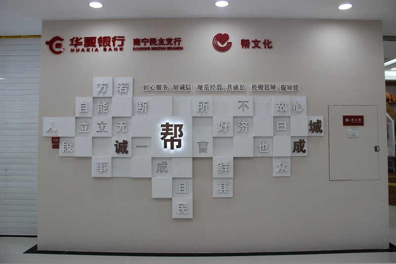 二是提炼服务文化内核。服务文化是文明规范服务的灵魂,它是支行服务的特色描述。民主支行进行了多次头脑风暴,提炼出“帮 cheng”这个文化主题。“能帮就帮,敢做善成”是南宁的城市精神, 一个“帮”字就能把南宁人的精神高度提炼;从银行社会责任来说,“帮”体现了服务客户的责任担当。“敢做善成”引申出“cheng”这个内涵,是民主支行多年来扎根邕城辐射八桂,与客户共成长,为客户提供真诚服务的生动描述。