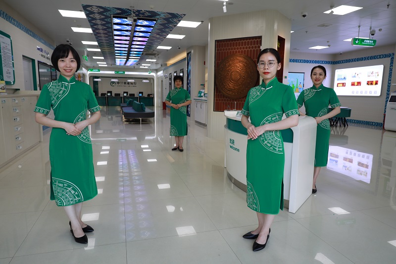 营业室扎根于八桂大地,四十余载间,在金融变革浪潮之中不断摸索创新,取壮族源文化之荟萃, 融农业银行之核心价值,承金融服务文化之内涵,重构厅堂环境布局,将“鼓乐江南”的精气神贯穿于网点, 带给广大客户全新的民族化、数字化、智能化的服务体验。在“旗袍服务日”期间,全体员工齐换上带有壮乡铜鼓图案的旗袍,喜迎八方来客。