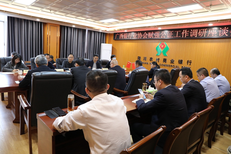 10月21、22日,广西银行业协会专职副会长吴庆平带队先后赴陆川农商行及北流农信联社就赋强公证业务开展情况进行走访调研,并召开赋强公证专题座谈会,广西银行业协会法律工作委员会副主任单位、自治区农信联社法律合规部总经理韦金胜,玉林银行业协会专职副会长吕剑军,陆川、北流地方法院及公证处领导参加座谈。