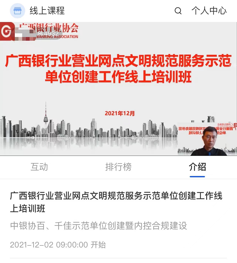 12月2日,为进一步加强行业诚信自律建设,培育优秀的服务文化,提高行业整体服务能力,持续推动广西银行业文明规范服务上台阶,结合中银协最近下发的《银行业营业网点文明规范服务示范单位创建管理办法》新要求和新规定,广西银行业协会组织举办了银行业营业网点文明规范服务示范单位创建工作线上培训。协会文明规范服务专家库专家、荣获“2021年银行业营业网点文明规范服务千佳示范单位”相关人员、辖区各地市银行业协会和各会员单位负责文明规范服务工作的相关人员近伍仟人参加了此次线上直播培训。