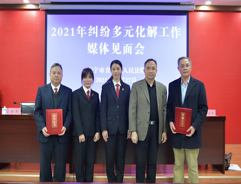 会议还对青秀区人民法院2021年优秀特邀调解组织、优秀特邀调解员进行表彰。广西银行业人民调解委员会被授予优秀特邀调解组织荣誉称号,同时调解员张建宁被授予优秀特邀调解员荣誉称号。