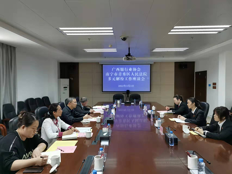 为进一步推进诉源治理工作,有效化解金融纠纷矛盾,3月3日上午,广西银行业协会专职副会长吴庆平带队到南宁市青秀区人民法院就多元解纷工作进行座谈。南宁市青秀区人民法院党组成员、副院长陈玉萍,立案庭负责人,以及广西银行业纠纷调解中心工作人员参加座谈会。