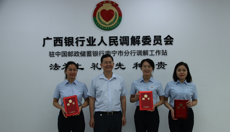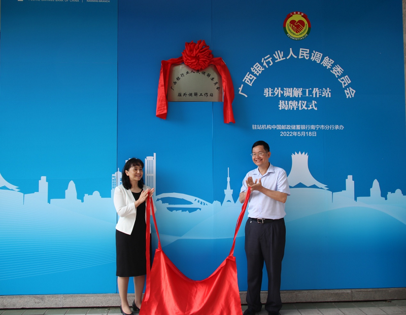 5月18日,广西银行业人民调解委员会(以下简称“银调委”)驻邮储银行南宁市分行调解工作站正式挂牌成立,这是广西银行业人民调解委员会第4家驻外调解工作站,广西银行业协会滕仲斌常务专职副会长、邮储银行广西区分行梁玉锦副行长、邮储银行南宁市分行罗杰行长及广西银行业纠纷调解中心黄淑珍主任参加揭牌仪式。