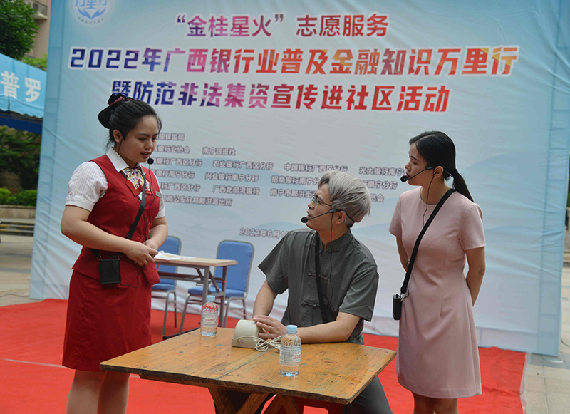 舞台上宣传反诈骗的小品、歌舞接连上演,舞台下观众看得津津有味。舞台两侧,银行工作人员正向群众讲解金融知识,与群众做互动游戏……6月15日上午,广西银行业协会组织10家银行机构走进南宁经开区金阳社区,开展2022年广西银行业普及金融知识万里行暨防范非法集资宣传进社区活动。这场活动形式多样,居民们开心参与的同时,还学到了不少金融知识。