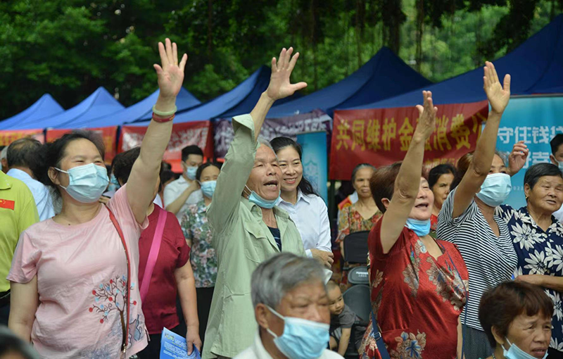 ▲现场参加活动的居民高兴地加入“刘三姐”“阿牛哥”的队伍一起开展金融知识宣传