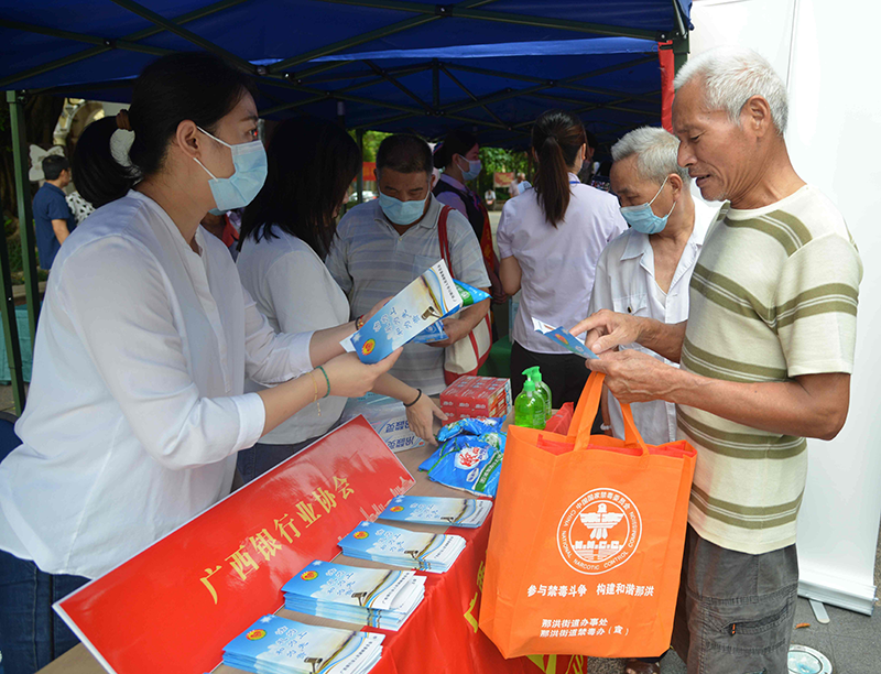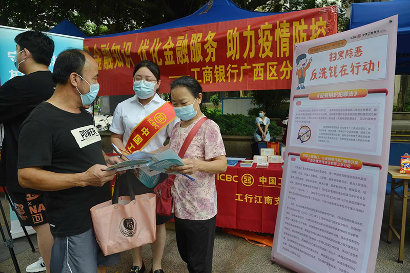 ▲广西银行业协会工作人员现场给居民发放金融知识宣传资料并讲解